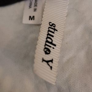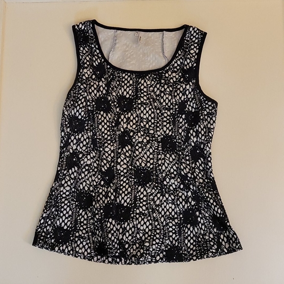 Fitted in bust and flares out at the bottom. Very pretty black and cream lace design.