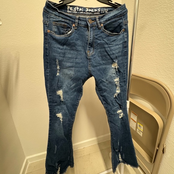 Barely worn (once), ripped, and is by the brand “Pastel Jeans.”
