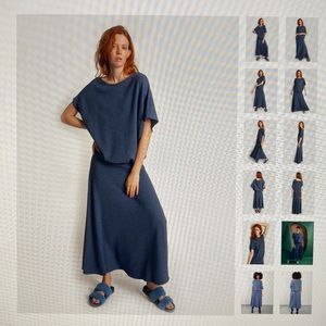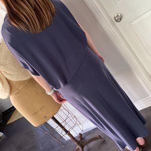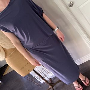 Blue dress, gently worn, excellent condition. Purchased NYC 3/2022. Asymmetrical top hemline, short sleeve and adjustable length and waistline. Travels super in a suitcase. Dress up or down.