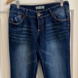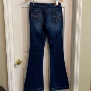 Flared jeans, gently worn, 34in inseam, polyester cotton spandex blend