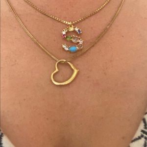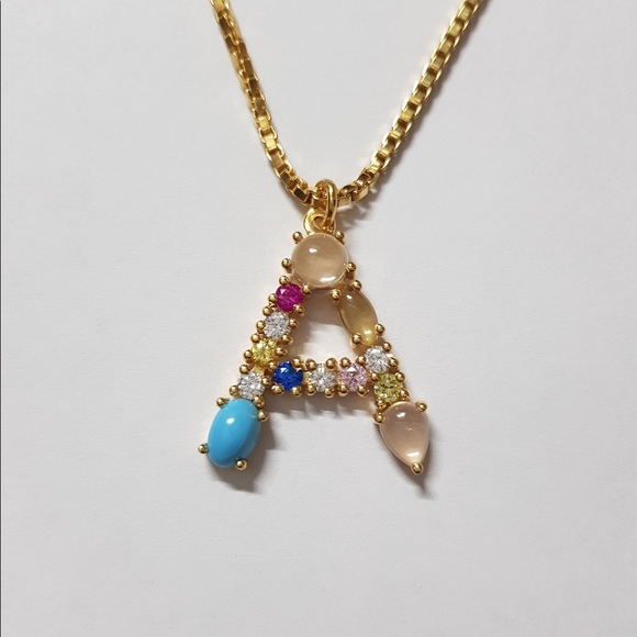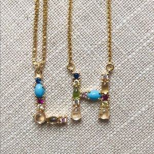 Anthropologie LETTER pendants 16”-18” adjustable chain length. Synthetic colorful summer stones and 18 karat plated gold.