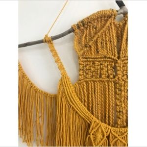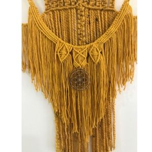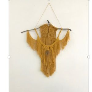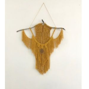 This Piece has been named Momma. It is made A blend of acrylic and wool yarn, as well as 100% Cotton Rope and Hangs on a foraged drift wood branch.
