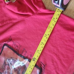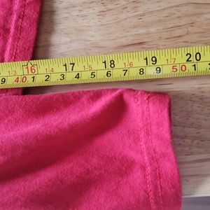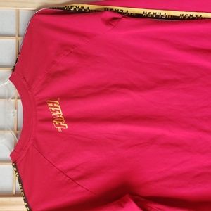 Red tee with yellow/ black lettering down each sleeve