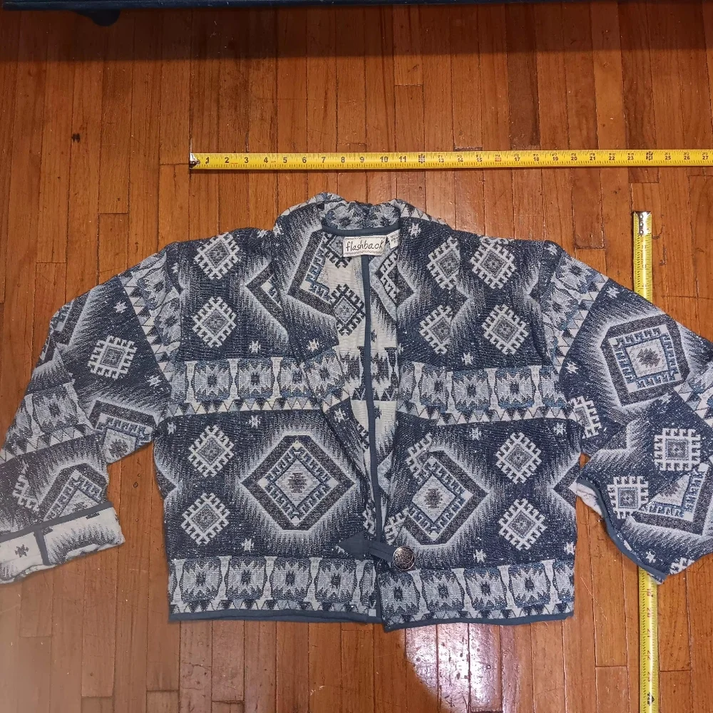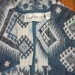 Stylish jacket with a geometric pattern in blue and white. Perfect for a trendy look.