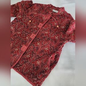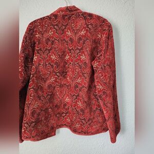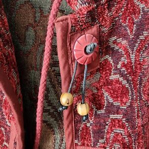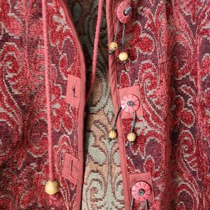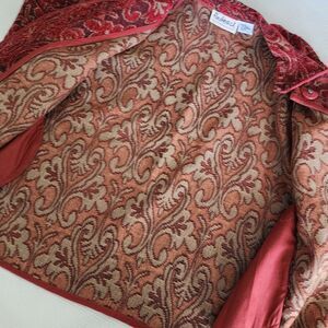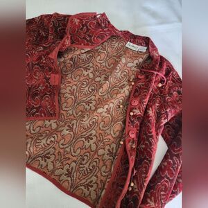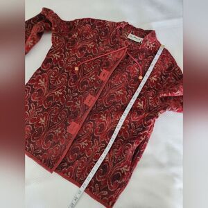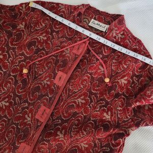 Chic red jacket with intricate patterns and button accents. Ideal for any event.