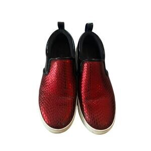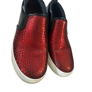 Step out in style with these glamorous Marc by Marc Jacobs slip-on shoes! The eye-catching red and black design adds a pop of color to any outfit, while the comfortable fit makes them perfect for all-day wear. These shoes are a size 37 and are ready to elevate your shoe collection. Don't miss out on this stylish and comfortable pair! They have a little wear on bottom as shown in pics but have plenty of life left in them.