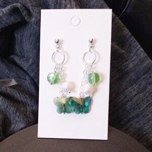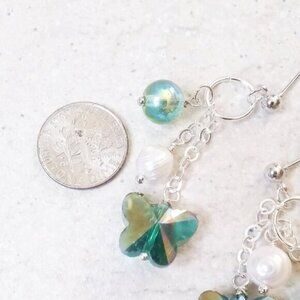 Flashy Teal Green Butterfly + Genuine Pearls! Handmade Cluster Dangle Earrings