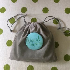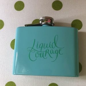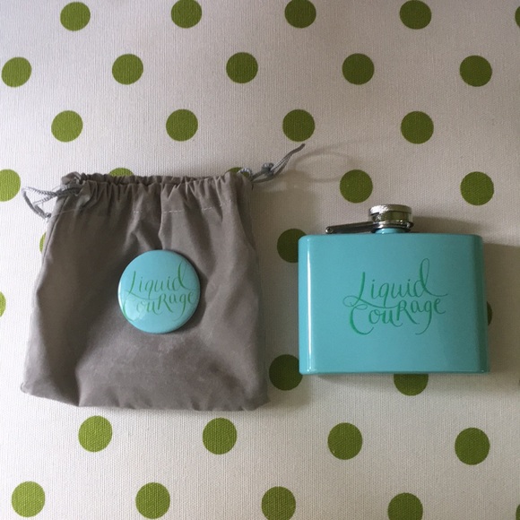 Giveessentials.com never used. Cute, small, aqua with green letters reading “liquid courage”. Comes in small gray pouch with matching pin. Never used.