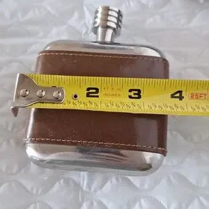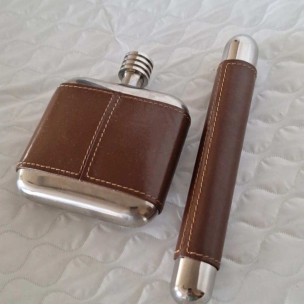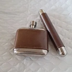 Flask set ten and leather in new Condition size 4" Tall 4" W secure Folder 61/2 See Picture