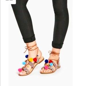 Embellished jubila gladiator sandals beaded Pom Pom laced up wrap from Just fab. Size 7.5 new no box. Price is final.
