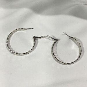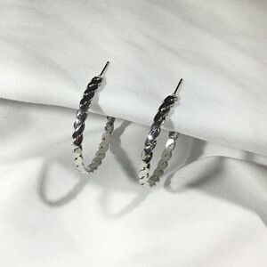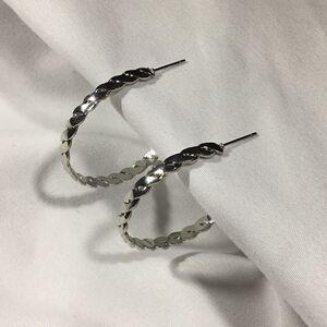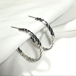 Flattened silver tone pieces intertwine in a slight twisting fashion