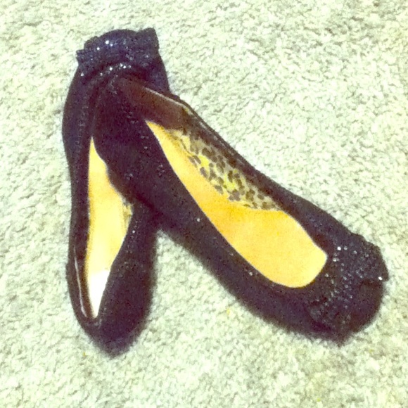 Black flats with gems with decorative bow in front
