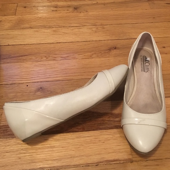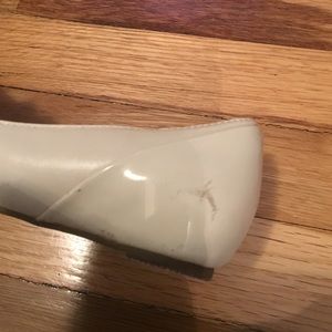 Cream leather flats with patent leather detailing, worn
