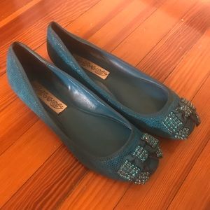 Beautiful teal velvety flats with rhinestone toe bow detail