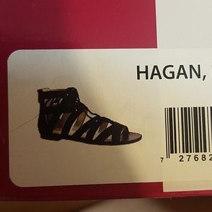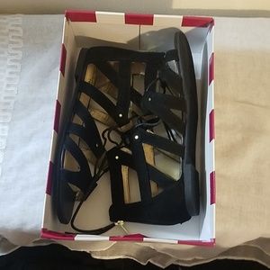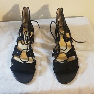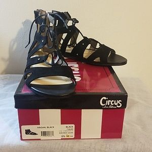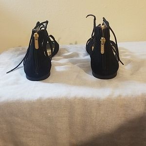 Adjustable lace flats. Soft black fabric with tan inner sole. Back zipper closure