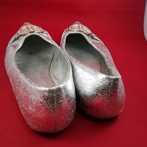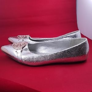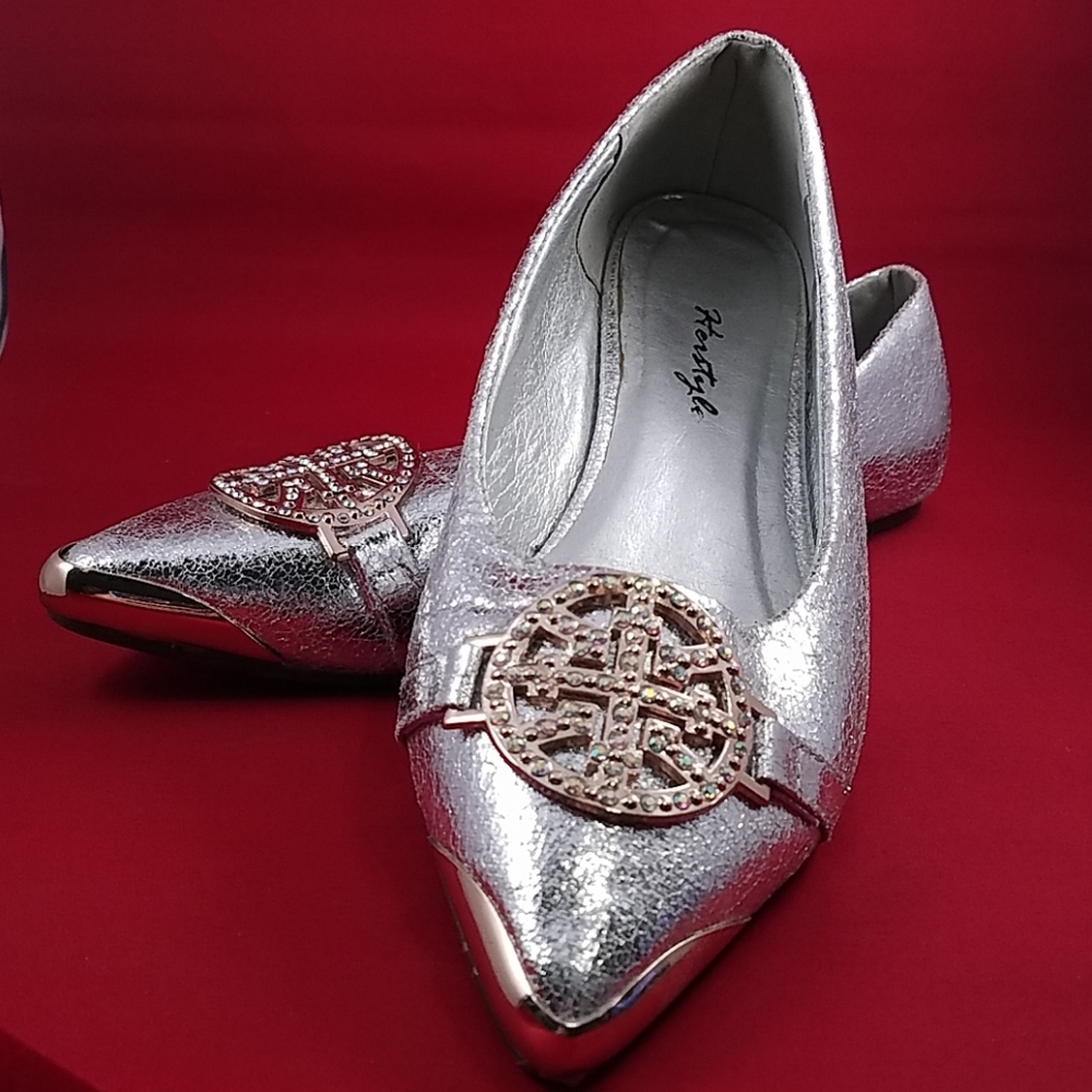 Flat, silver, big gold buckle on top. Gold tip.