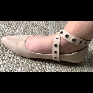 Pointed toe flats with wrap around ankle straps
