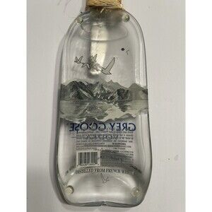 Flattened Grey Goose bottle repurposed as cheese tray or appetizer display accompanied by a cheese knife. The cutting board is made of clear glass with rubber bottom tabs to keep glass from slipping or scratching surface. This is preowned without tags but looks brand new. Great item for a gift or for a party.