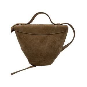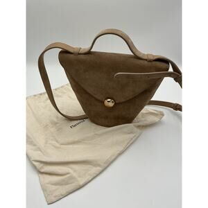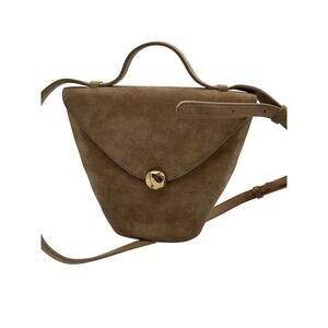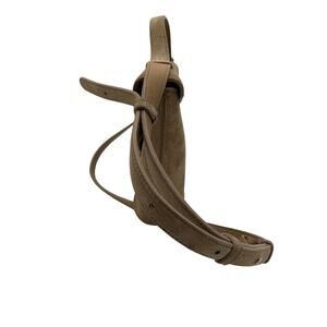 Flattered 'Evelina' Cream Suede Bag: suede exterior with canvas lining, magnetic flap closure, one main compartment, one interior slip pocket, adjustable shoulder strap.