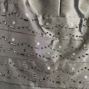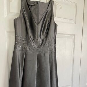 Size 8, gray with slight shimmer! Looks fantastic on its own or with a flattering Shawl or wrap! Can be worn in any season. The hanger doesn’t do it justice, you’ll look fantastic in this one! Like new condition!