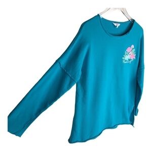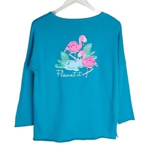 Super fun crewneck pullover sweatshirt with raw rolled hem in vibrant teal color. Goes along with the motto "If you've got it, flaunt it". Fun pink flamingo print on front and back. Size Medium. Excellent pre-owned condition, no visible flaws.