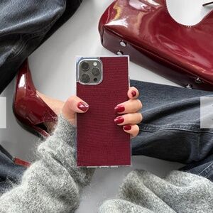 Square iPhone 14 Pro Max case in a beautiful burgundy lizard faux leather