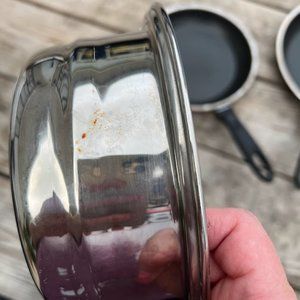 The boiler pan piece doesn't go with these pots but does fit nicely inside one of the pots so would be good for melting things like chocolate. It had a small brown mark on outside of it.