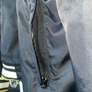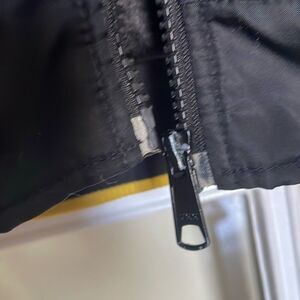 Has discoloration on the front between pockets as pictured. Minor marks shown in images are difficult to see when worn. Zipper has paint chipped. Mark on the collar. Right sleeve has two tears that can be most likely be sewn. Zipper is fully functional. Has an interior pocket.