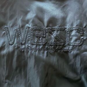 Willie men’s padded jacket black satin bomber jacket with WESC logo on the back.