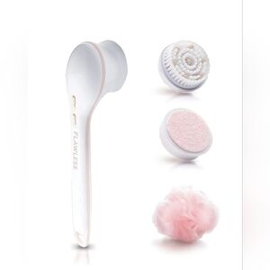 An original flawless spa body brush features an ergonomic handle. Operates on three AA batteries. Perfect option if you have limited mobility, ideal to wash your back in the shower. Includes only two attachments: loofah and body polishing head, new, unused. The exfoliating brush head has been used and not included.