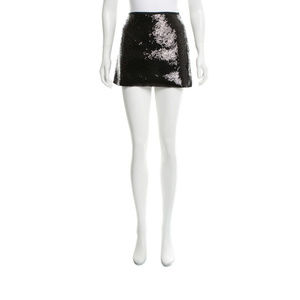 Flawless black Theory mini skirt with sequin embellishments throughout and concealed zip closure at side. Hit the town with this trendy little number! Authentic Theory. Winter can be warn with leggings and boots. Summer with bare legs and stilettos. Back zipper is hidden with hook & eye. A really special timeless piece. Have fun! Size 8. Retail $295.