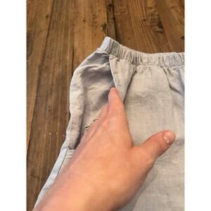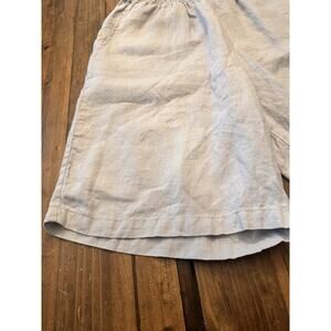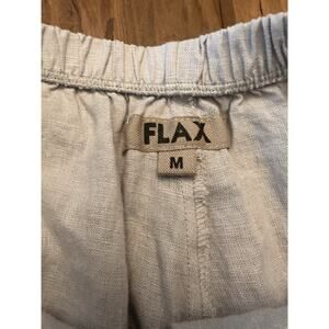 The product is a pair of wide-leg high-rise flax linen shorts by the brand FLAX. These relaxed-fit shorts feature a pull-on closure and are in a stylish boyfriend style. They are designed for a casual occasion and come in a size medium with a blue color. Made of 100% linen, they are perfect for warm weather and offer a comfortable and airy feel. Ideal for women who are looking for a stylish and easy-to-wear piece for their wardrobe.