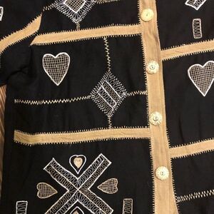Cotton flax blend shacket boxy top by Allure dress. Embroidered designs throughout, decorative ivory button down. Fully lined and intact. Rare vintage item in EUC
