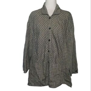 Flax Black Cream Button Front Grid Print 100% Linen Shacket Front Pockets Large