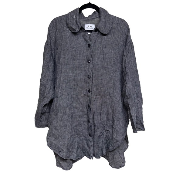 Elevate your wardrobe with this classic black and white striped button-up dress shirt oversized top by Flax By Jeanne Engelhart. Crafted from high-quality linen material, this pre-owned top is perfect for travel or casual occasions. The long-sleeved top features a collared neckline and button closure, with casual sleeves for a relaxed fit.