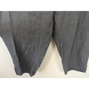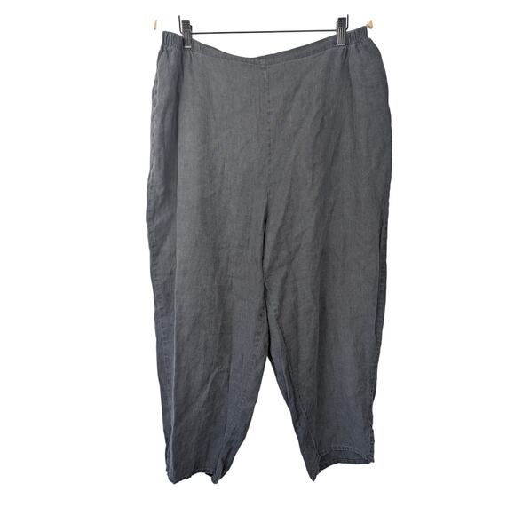 Flax Dark Grey Linen Lagenlook Baggy Tapered Leg High Rise Pull On Pant. Stretchy waistband, small slits on side on pant legs, cropped.