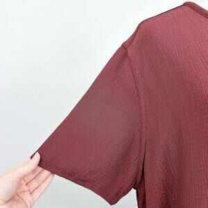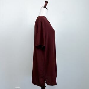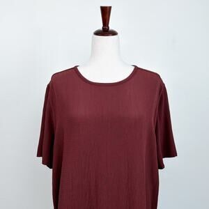 Size Small (very oversized) tunic tee-shirt. Crinkle textured reddish/brown rayon fabric. (Color description is just my opinion so please refer to all photos.) Side vents. No flaws, great condition!