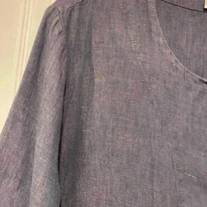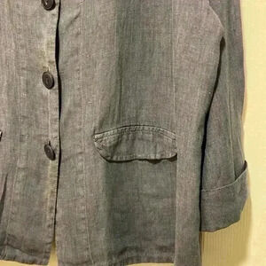 This is a beautiful and classy looking lightweight jacket by flax. It is 100% linen and is in a pretty soft blue. It has very attractive buttons, cuffed skeeves as well as pockets. Measurements are in the pictures. Thank you for considering my item.🌻