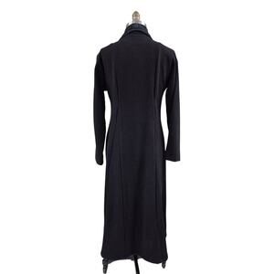 The Flax by Jeanne Engelhart is a coat crafted from 100% wool featuring a textured design complemented by a cotton velour trim. This is fully lined in uniquely textured satin. The maxi coat is adorned with a subtle plum velour trim. It includes two front pockets and incorporates a princess line silhouette for an enhanced fit. The size small garment is in excellent condition, meticulously cleaned, and well-maintained.