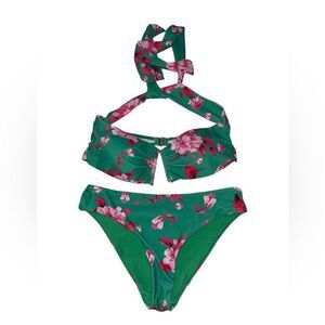Flax marker Large Green and Pink Floral Bikini two piece tie neck soft padded