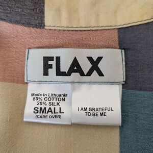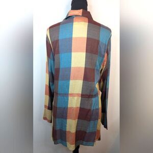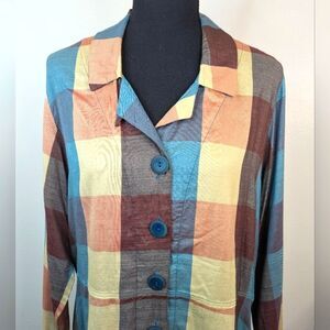 Description: Flax Buffalo Check Preppy Academia Coastal Country Lagenlook Button Down, fun buffalo check pattern, complimentary blue buttons, comes with spare button, made in Lithuania, tag reads "I am grateful to be me""