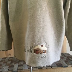 @amandanadu21 it is embroidered on the bottom of the back of the sweater. It’s a cabin scene with the word “mcall” the image is embroidered