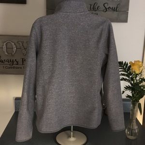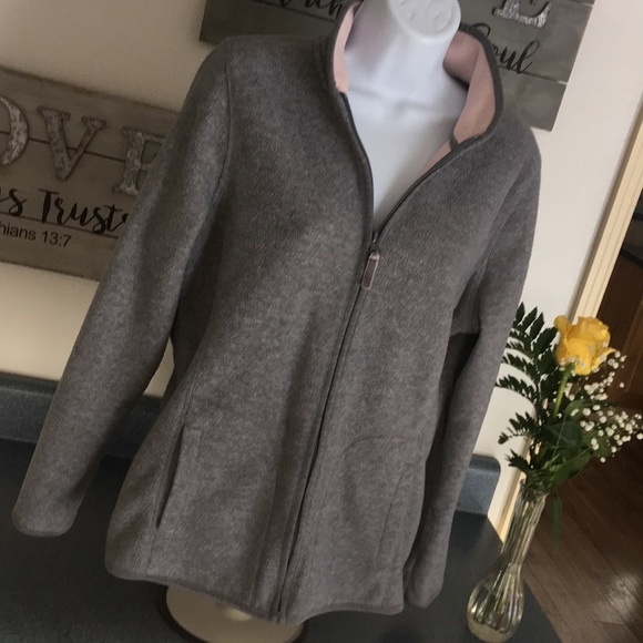 This fleece jacket is grey on the outside with a pink lining. Size medium.
