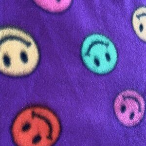 Up for sale is this nice Fleece Multicolored Smiley Faces Home New Fabric Cut . New condition with some flaws (check the pics). Size 65” X 84”. Check my other listings.