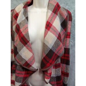 Open front vest women large ruffled plaid red brown beige pockets cozy warmth. This vest is made of 36% cotton 65% polyester and is machine washable. All measurements are done with item laying flat