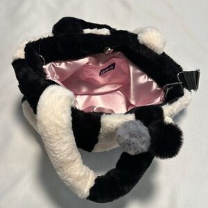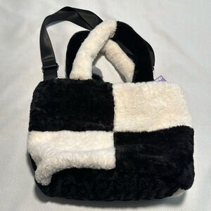 This is new with tags. The color is black and white. The strap is removable and adjustable. The hardware is silver. Magnetic snap close. The fabric is sherpa fleece. So soft against your skin! The length is 15 inches. The height is 11 inches. The width is about 6 inches or more.