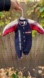 • Front is all over navy with red/burgundy color on underarm of sleeves