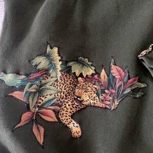 Rare vintage (90’s) Army Green button down jacket with a totally comfortable FLEECE sweatshirt feel. Has decorative embroidered Lyon, tiger and parrot appliqué. Button down in brown perfectly matching animal prints border ( see pictures) lots of nice details.
