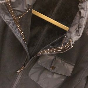 Men’s size small. I wore this as a comfy jacket. Navy blue - fleece and nylon. Super cute and cozy.