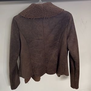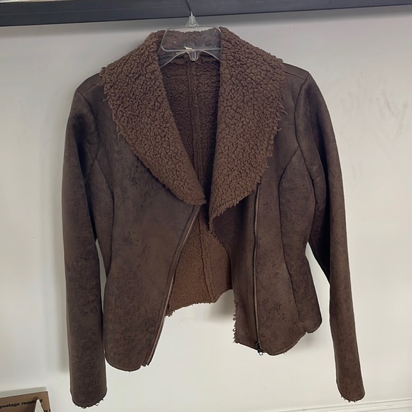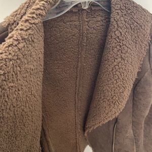 Soft fleece like material inside. Suede like jacket outside. Comfy and warm. 2 pockets on each side. Size medium